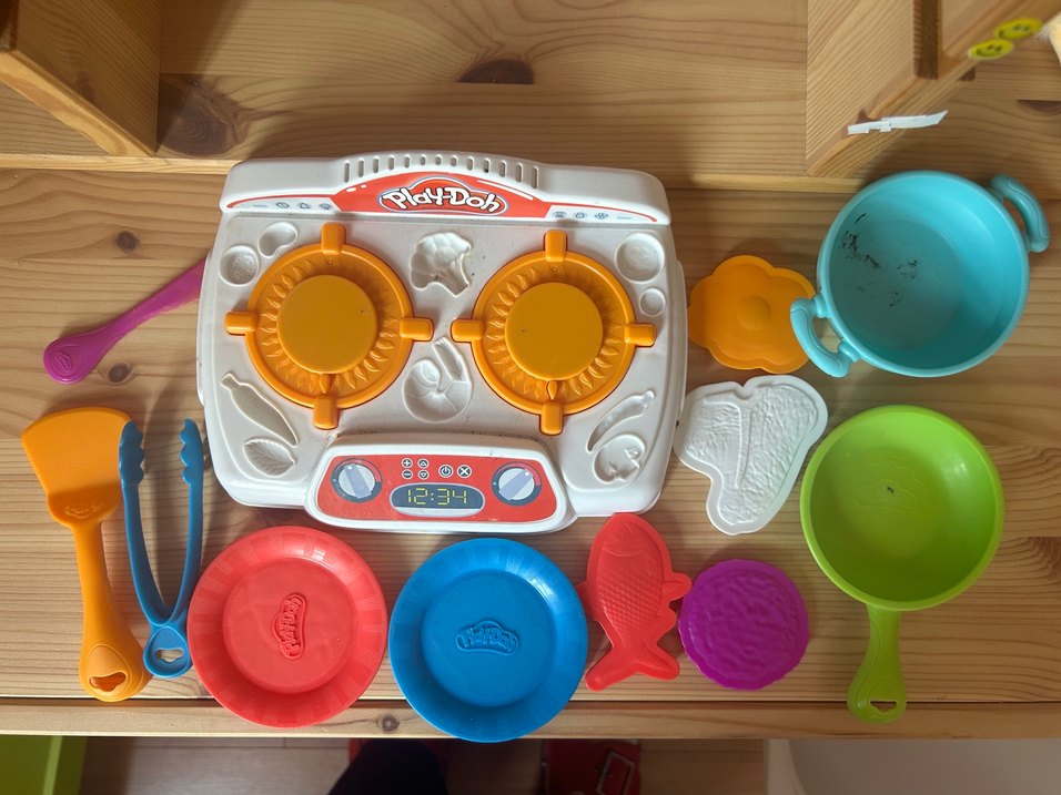 1 Tencere, 1 tava, 4 adet kalıp, 1 ocak(pişirme sesi çıkarıyor, kenarları yiyecek kalıpları ile dolu) 2 adet tabak (arkalarında yiyecek kalıpları var), bıcak, spatula ve maşa Sapasağlam ve çok eğlenceli sadece temizlik gerekir
