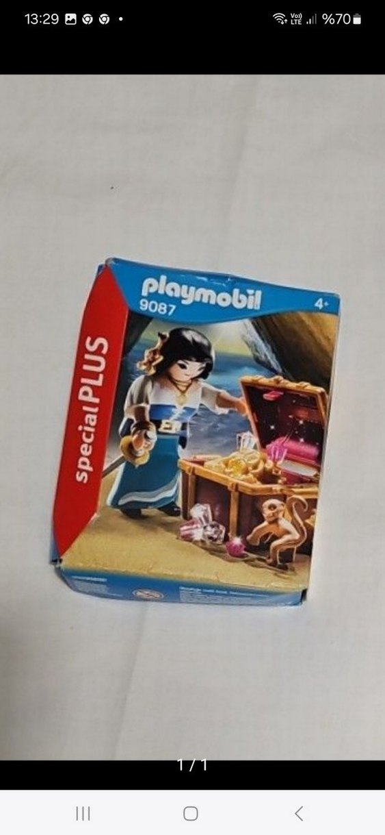 Playmobil 9087 figürü, koyu mavi kıyafetli ve hazine sandığı ile küçük maymun aksesuarı içerir. 4 yaş ve üzeri için uygundur.