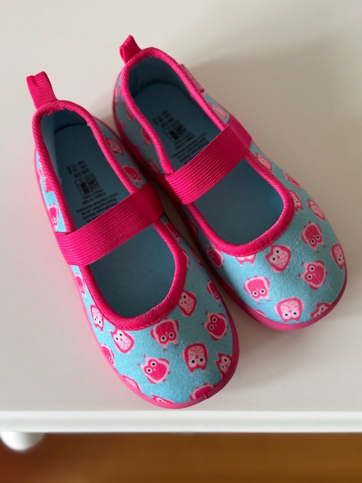 Kız çocukları için renkli baskılı, kaydırmaz tabanlı ve lastik bantlı iç mekan (ev/anaokulu vs) ayakkabısı. Alman Playshoes marka. Marka bedeni 28/29 numaradır.