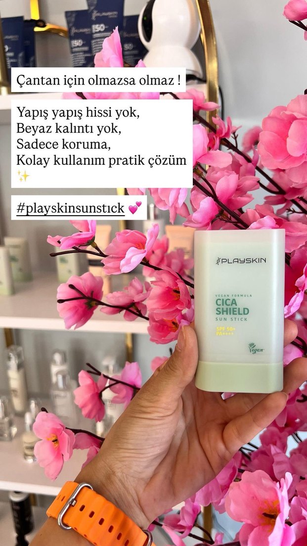 Playskin Cica Shield güneş koruyucu stick, yapışkan his ve beyaz kalıntı bırakmadan kolay kullanım sunar. Çantada taşımak için uygundur. ☀️