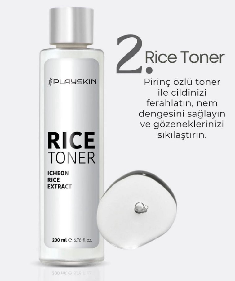 Playskin pirinç özlü tonik, cildi ferahlatır, nem dengesini sağlar ve gözenekleri sıkılaştırır. 200ml şişede sunulur.