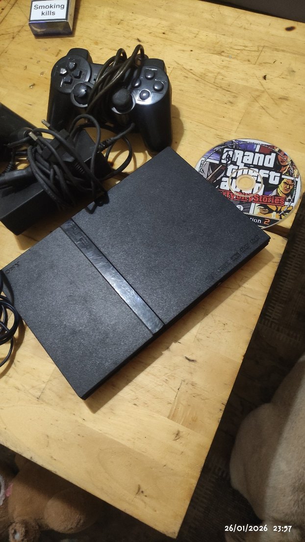PlayStation 2 konsol, kablolu kumanda, güç adaptörü ve GTA oyun diski ile birlikte. Klasik oyun deneyimi için gerekli aksesuarlar mevcut.