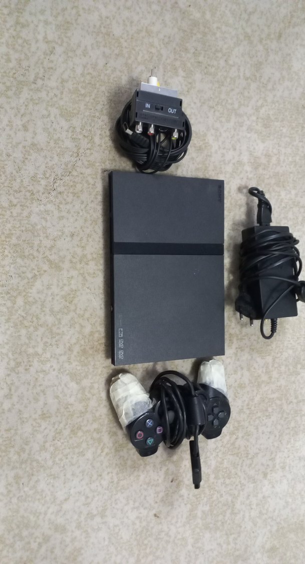 PlayStation 2 konsol, bantlanmış kollarıyla bir kontrol cihazı, güç adaptörü ve giriş/çıkış bağlantılı AV kabloları içerir.