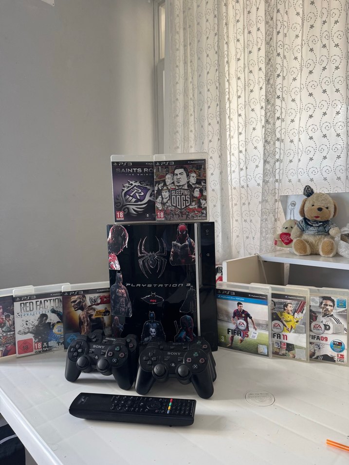 PlayStation 3 konsol, iki kontrol cihazı ve Red Dead Redemption, Saints Row, FIFA gibi popüler oyunlar koleksiyonu. Uzaktan kumanda dahil. Ürün çalışır durumda sistem kırıldı içine gerekli programlar atıldı ücretsiz dilediğiniz oyunu indirip oynaya bilirsiniz 6 adet kol 5 tanesi SONY 1 tanesi polygold marka bazılarında sıkıntılar var kolların 1 adet orjinal kumandası çalışmıyor baktırmadım ufak bir tamirle düzelir. 8 adet cd oyun Fotoğrafta görünenler Ayriyetten cihazın içindeki oyunlar Deadpool Little BIG Planet 3 Mıncraft Moto GP 14 Absolute Supercars Mortal Kombat Tomb radar Snıper Elite 3 Red Dead Redemptıon Pes 2017 Pes 2013 Nascar 15 Mafıa 2 Lego marvel super GTA 5 FIFA 18 Farcry 4 Farcry 3 Ve daha fazlası mevcut Netflex YouTube var sistem kırmayı iptal ederseniz sorunsuz çalıyor
