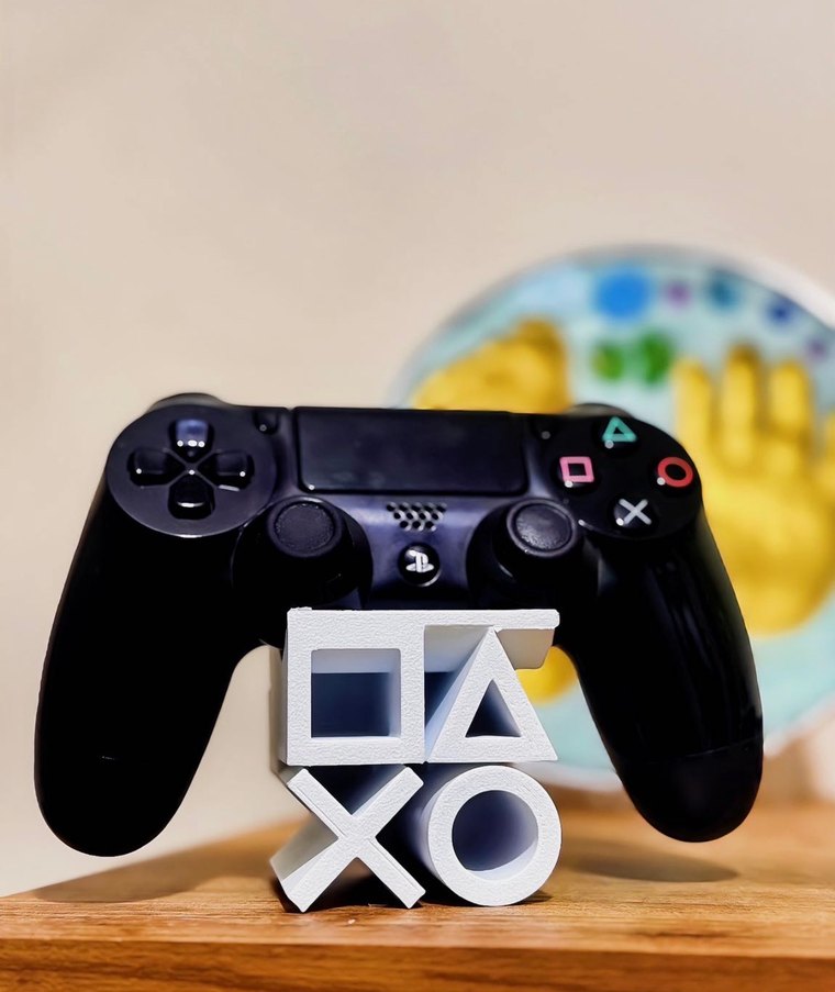 Beyaz PlayStation düğme sembollerinden oluşan, kumandayı tutan PlayStation kumanda standı. Ahşap yüzey üzerinde yer alır.