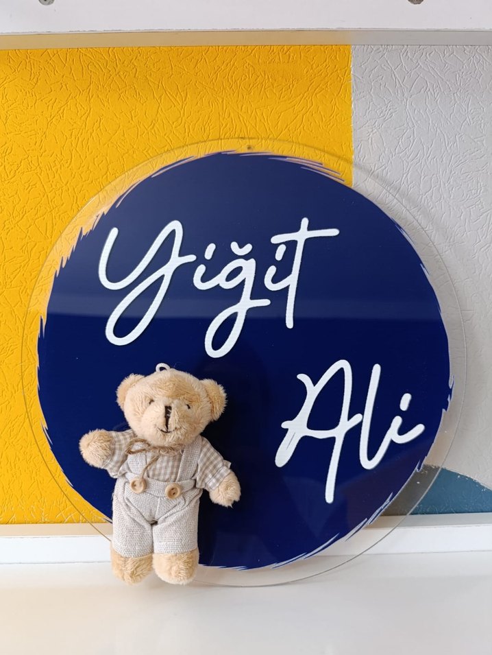 Üzerinde beyaz el yazısı ile isim yazılı, açık mavi yuvarlak pleksi ve bej renkli küçük peluş ayıcıklı