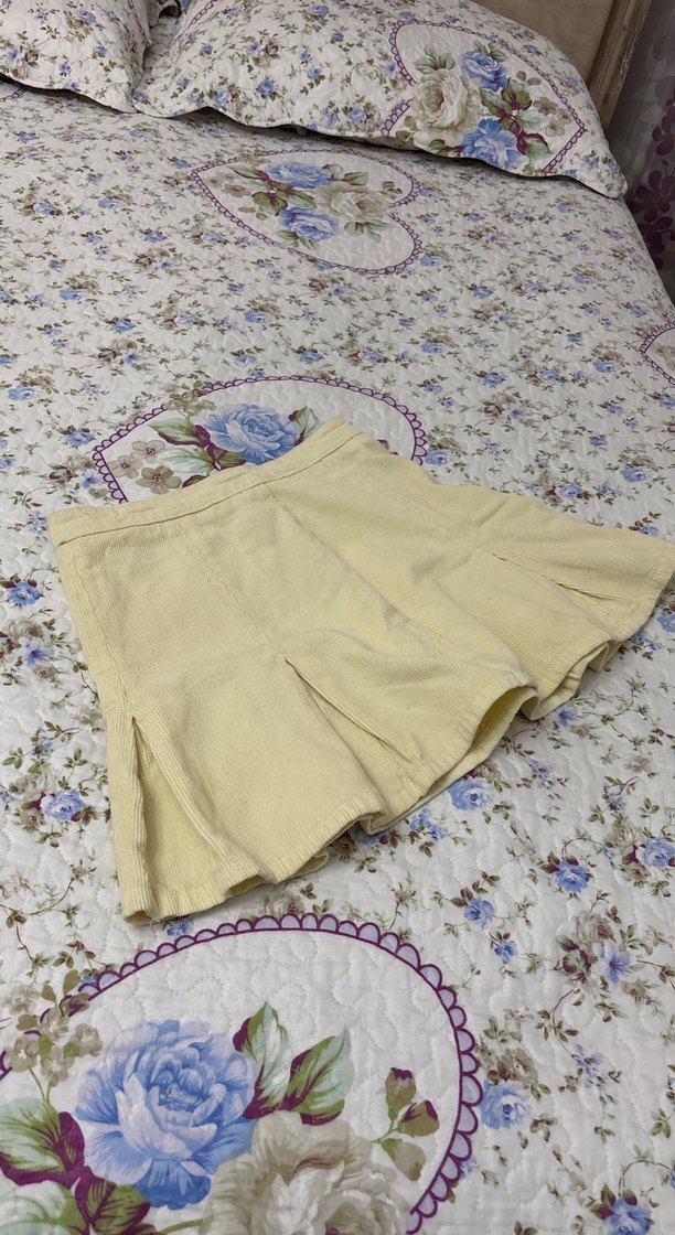 Yumuşak ve rahat keten kumaştan, bol kesim sarı mini etek, pliseli detaylarla günlük bohem tarz sunar.