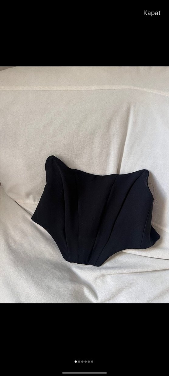 Plise detaylı, kayık yaka ve ince askılı siyah mini bustiyer. Sokak modasına uygun, vücuda oturan kesim.