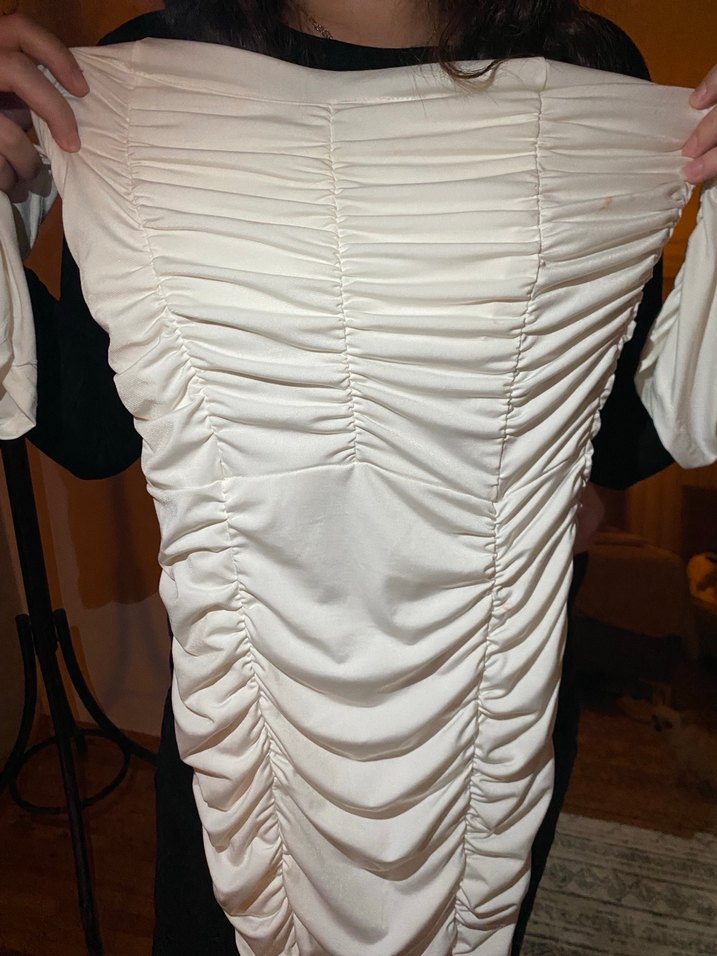 Parlak beyaz keten kumaştan, pliseli ve vücuda oturan midi uzunlukta elbiss Avant-garde goth tarzıyla parti için uygundur. Kösesinde cok hafif leke var