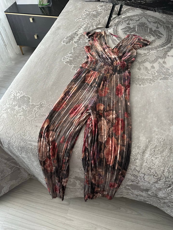 Kadınlar için uzun boy, straplez yaka ve ince askılı, sentetik kumaştan yapılmış, koyu çok renkli batik desenli ve pliseli, bohem tarzda dar kesim tulum.