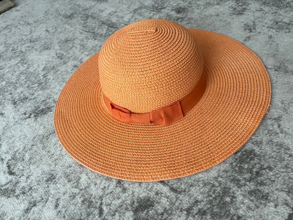 Sentetik kumaştan yapılmış, pliseli ve fiyonk detaylı bej kadın bohem şapka.