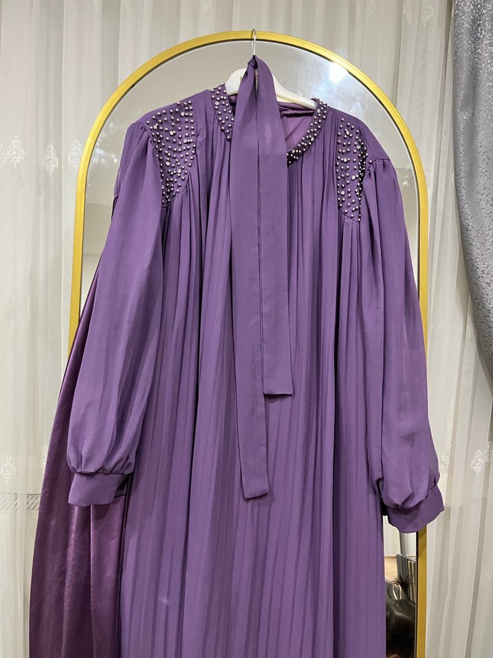 Pliseli mor abiye şal ile birlikte