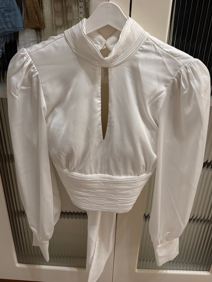 Pliseli detaylı, yüksek yakalı ve uzun kollu beyaz bluz. İnce, parlak kumaştan olup kısa ve vücuda oturan kesime sahiptir. Kendinden südyenli sırtı bağlamalı Sbedene uygun