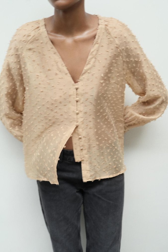 Uzun kollu, V yakalı bluz. Kabartmalı plumeti işlemeli kumaştan ve ham kenarlara sahip. Uyumlu, kapalı düğmeler.
