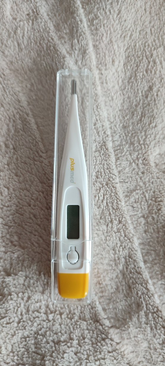 Plus Med dijital termometre, kolay okunabilir ekran ve koruyucu şeffaf kutu ile gri ve beyaz tasarıma sahiptir. ️Sıfır ürün hiç kullanılmadı.