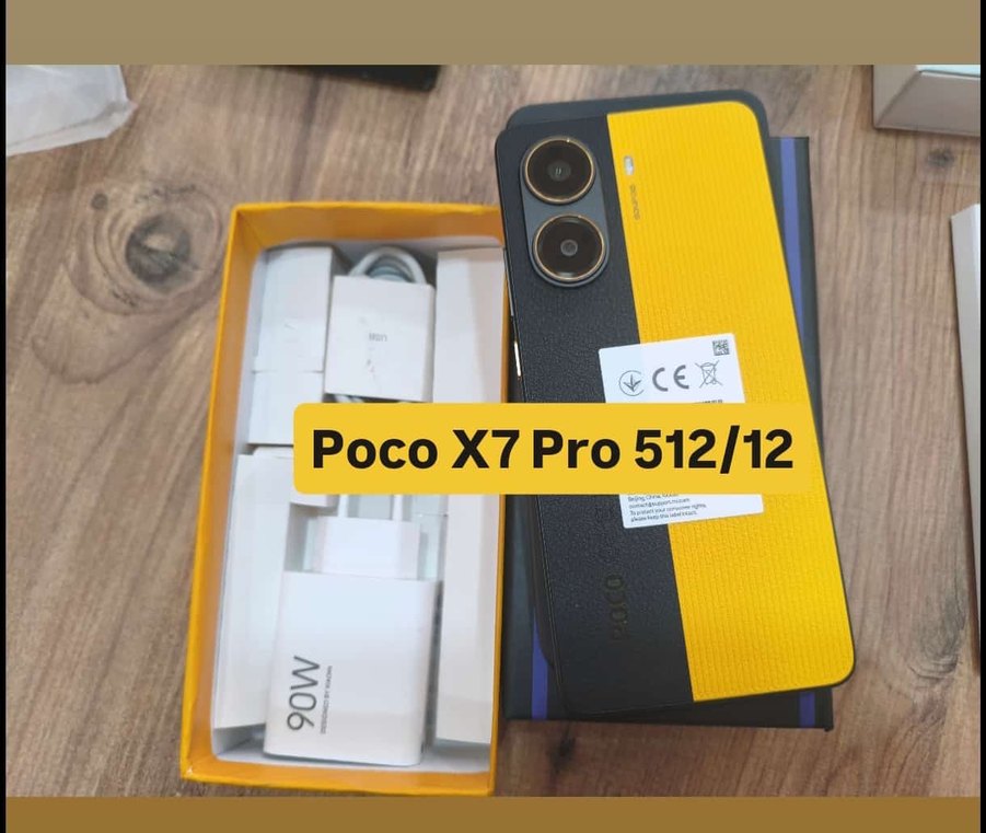 Poco X7 Pro, 512GB depolama ve 12GB RAM ile sarı ve koyu renk kombinasyonunda. 90W şarj cihazı ve çift arka kamera bulunur.