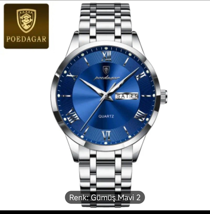 poedagar markasının modern klasik tasarıma sahip, mavi kadranlı ve gümüş renk metal kayışlı erkek saati. Quartz mekanizma ve gün-tarih göstergesi bulunur. ⌚su geçirmez 3 ATM sıfır etiketli hiç kullanılmadı