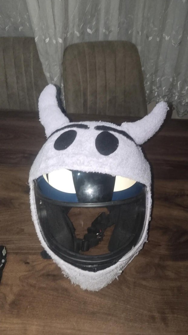 Bu beyaz motosiklet kaskı, yumuşak ve pofuduk dış yüzeye sahip olup, eğlenceli boynuzlu tasarımı ve belirgin siyah gözleriyle punk rock havası sunar. ️