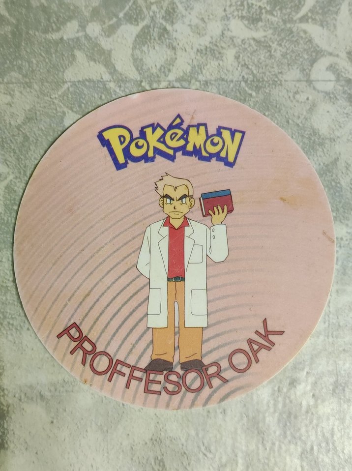 Açık bej renkte, elinde kitap tutan Pokémon Profesör Oak figürü. Üzerinde 'PROFFESOR OAK' ve Pokémon logosu bulunur. 2000 li yıllar Bakkal dev taso Prof.Oak.
