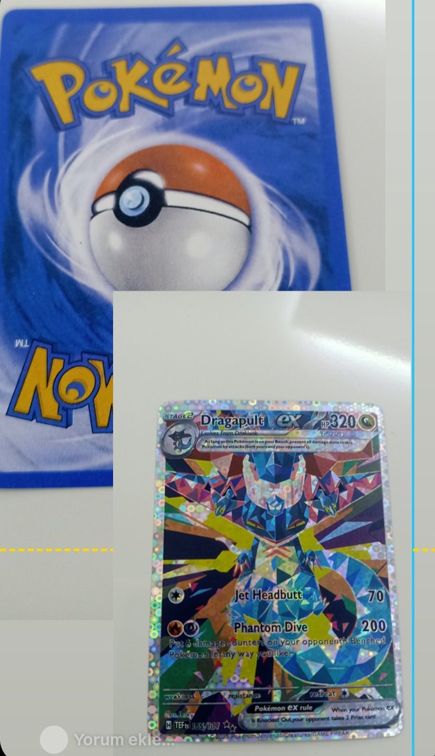 Çok renkli ve holografik efektli Pokémon dragapult, 'Phantom Dive' ve 'Jet Headbutt' gibi önemli kart detaylarını içerir.