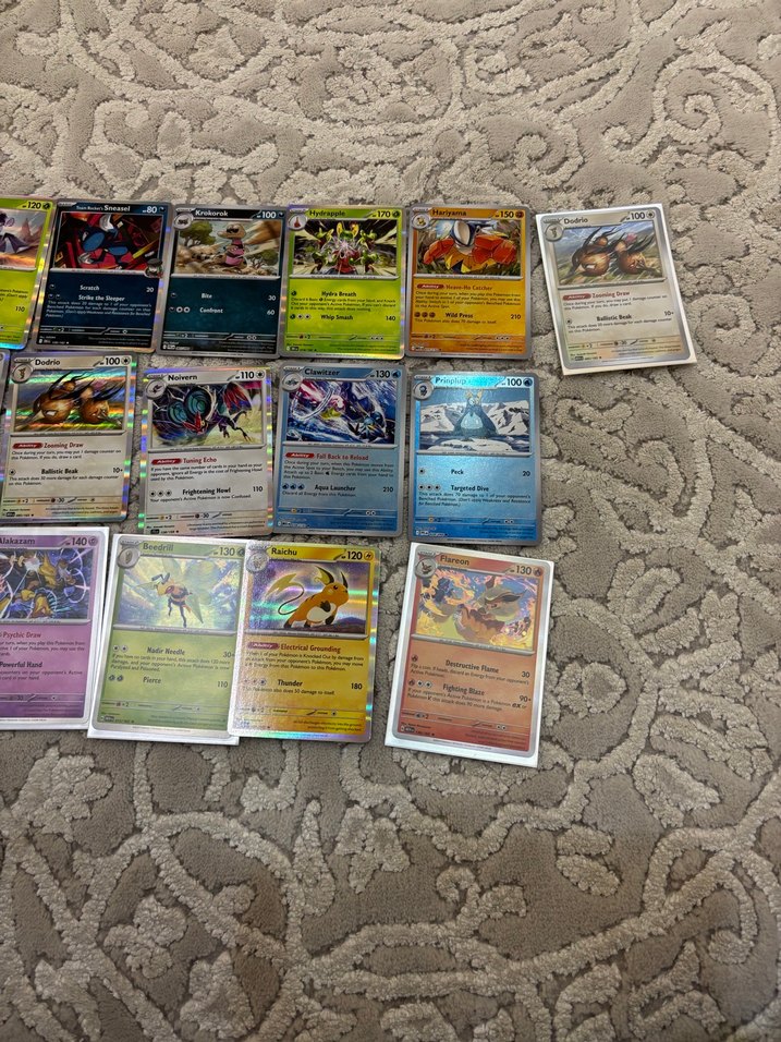 Farklı karakter ve yeteneklere sahip çok renkli oyun kartları seti, desenli bir zeminde dizili.
