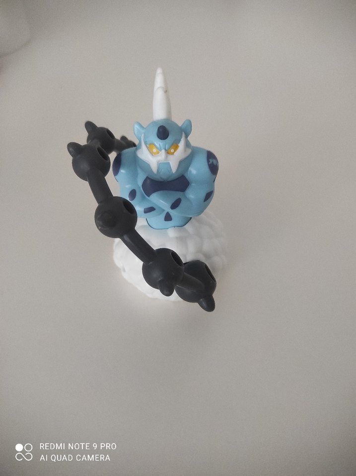 Mavi renkli aksiyon figürü, boynuzlu ve siyah silah detaylarıyla bulut şeklinde bir taban üzerinde duruyor.