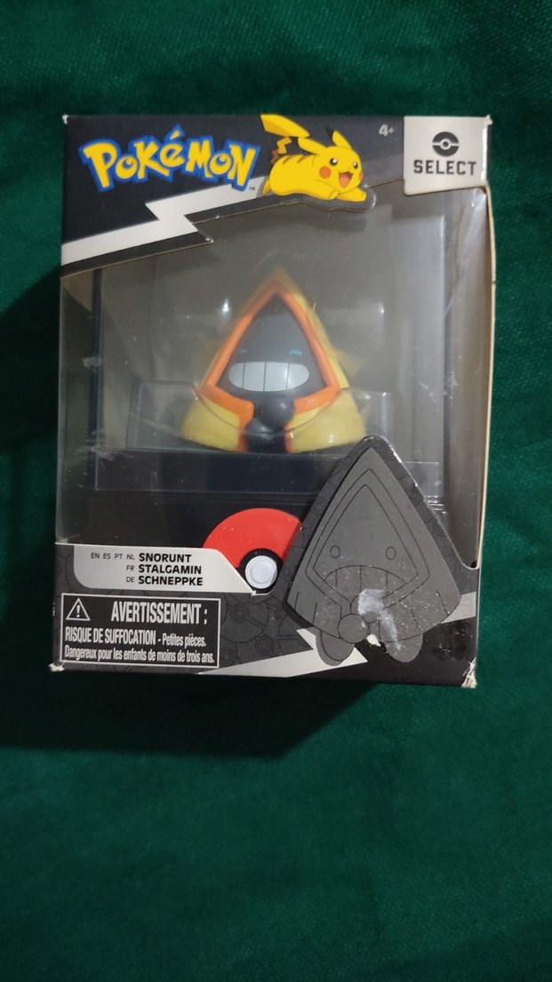 Pokémon Snorunt figür oyuncak, koyu sarı renkte olup Poké Topu desenli kutusunda sunulmaktadır. 4 yaş ve üzeri için uygundur. ⚡