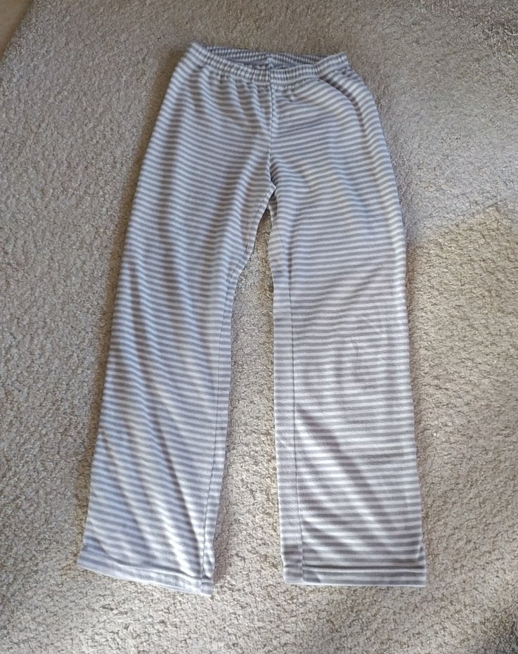 Gri beyaz çizgili, polar pijama/eşofman. Günlük rahat kullanım için uygundur.