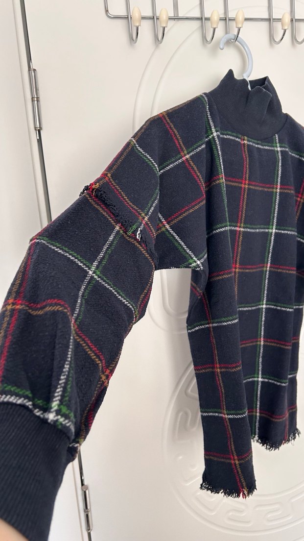Kadın boğazlı ve uzun kollu, Yumuşak tekstil kumaştan, kareli desenli ve normal boyda, rahat kesimlidir.