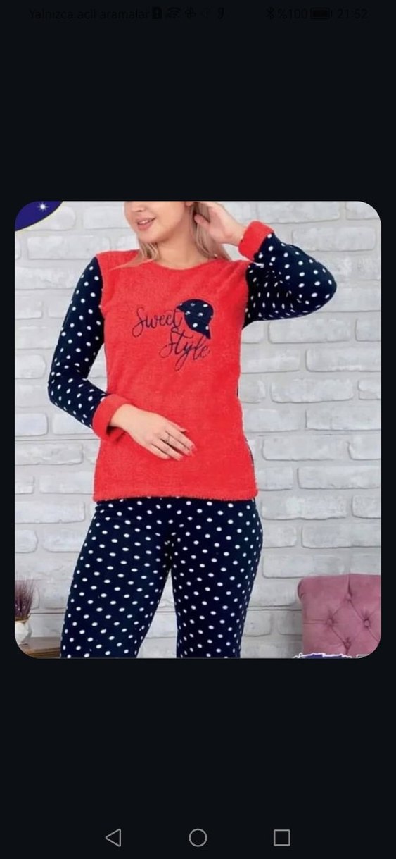 Kadın pijama takımı, uzun kollu ve kısa kesimdir. Üstü kırmızı, kolları ve pantolonu renkli puantiyeli desene sahiptir. Rahat ve konforludur. Polar kumaştan yapılmıştır