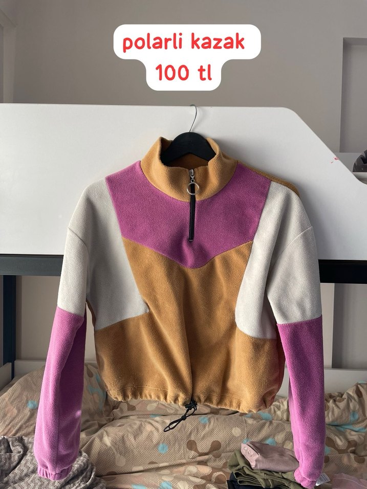 Yarım fermuarlı, yüksek yakalı, uzun kollu, yumuşak polar kumaştan yapılmış, pastel çok renkli baskılı, rahat kesim midi uzunluğunda kadın sweatshirtü.