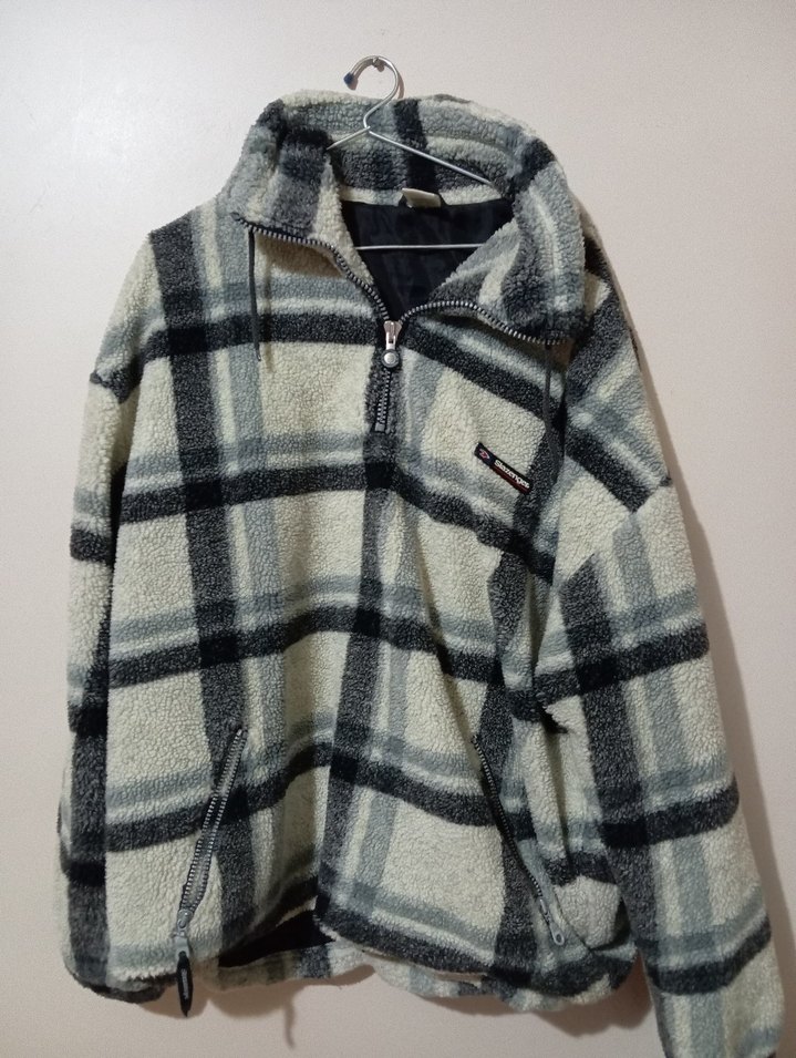 Gri ekose desenli erkek polar sweatshirt, yüksek yakalı ve fermuarlı, bol kesim ve günlük rahat kullanım için uygundur. 3 de 1 fiyatına kaçırmayın
