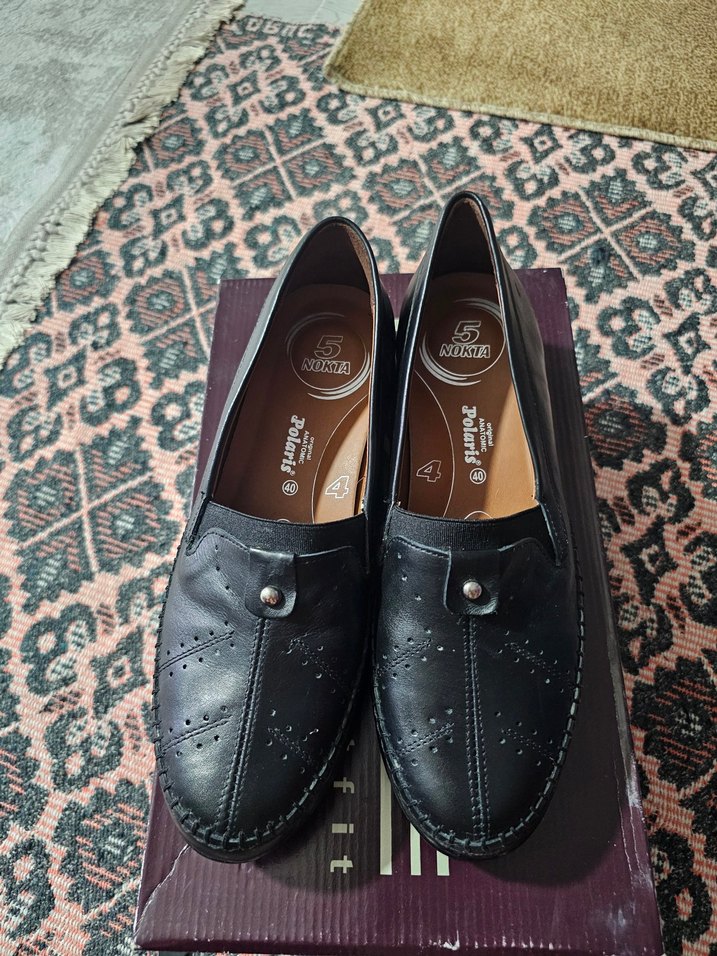 Düğmeli ve nakışlı detaylara sahip siyah kadın dolgu topuk ayakkabi 40 numara deri malzemeden üretilmiş, blok topuklu ve günlük kullanım için uygun.