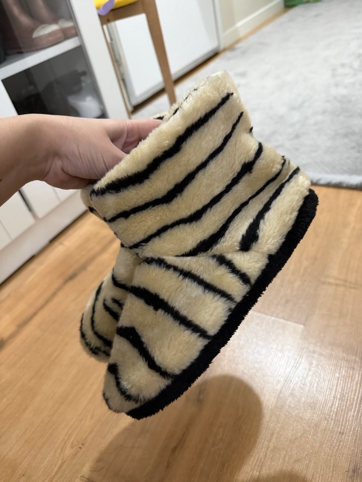 Kız çocukları için beyaz ve gri tonlarında zebra desenli, kürk detaylı ve yumuşak fleece malzemeden yapılmış sıcak terlikler. Streetwear tarzına uygun.