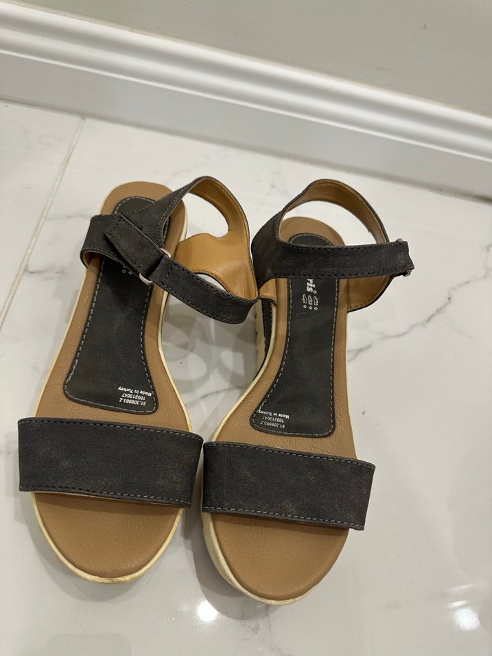 Gri renkli, tokalı kadın dolgu topuklu sandaletler, rahat kauçuk tabana sahip olup günlük kullanıma uygundur. Desensiz ve çağdaş tasarımdadır.