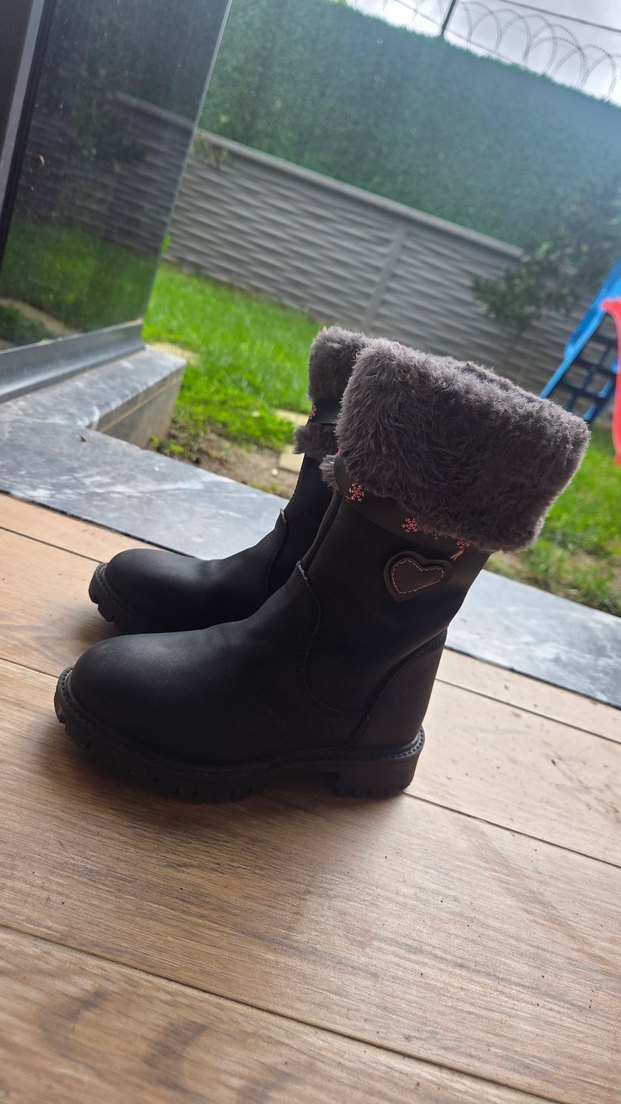 Bu kız çocuk botları, üst kısmında gri kürk detayları ve kauçuk dış yüzeye sahiptir. Goth tarzında, kalp figürlü ve trend bir görünüme sahiptir.