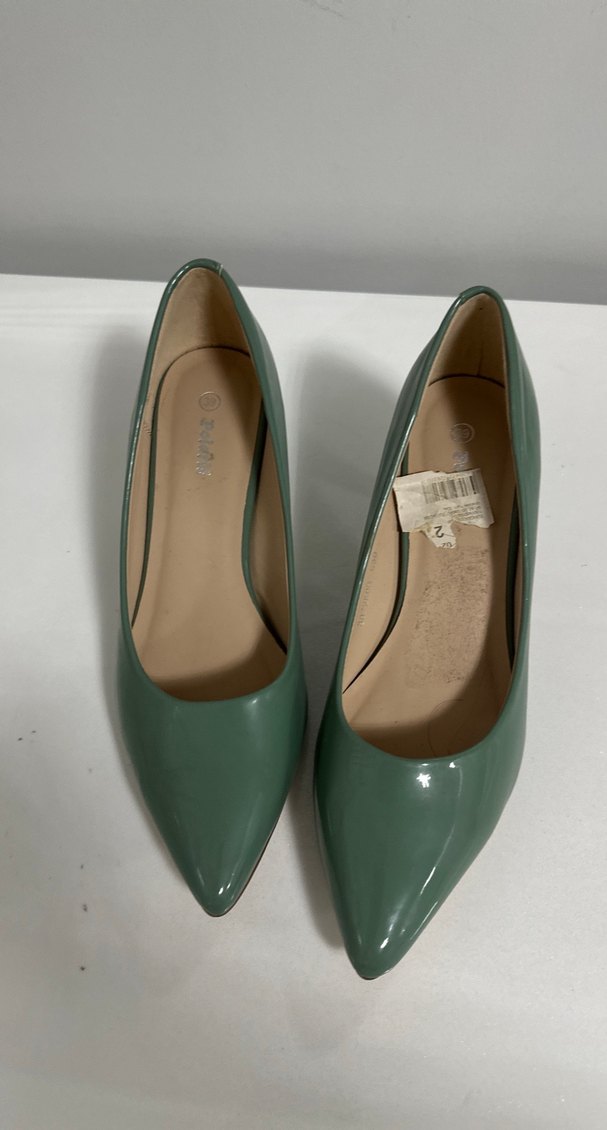 Pastel yeşil renkte, düz ve minimalist tasarımlı, kauçuk malzemeden stiletto topuklu ayakkabılar. Çağdaş ofis stiline uygun, zahmetsiz şıklık sunar. Ürün sıfırdır.