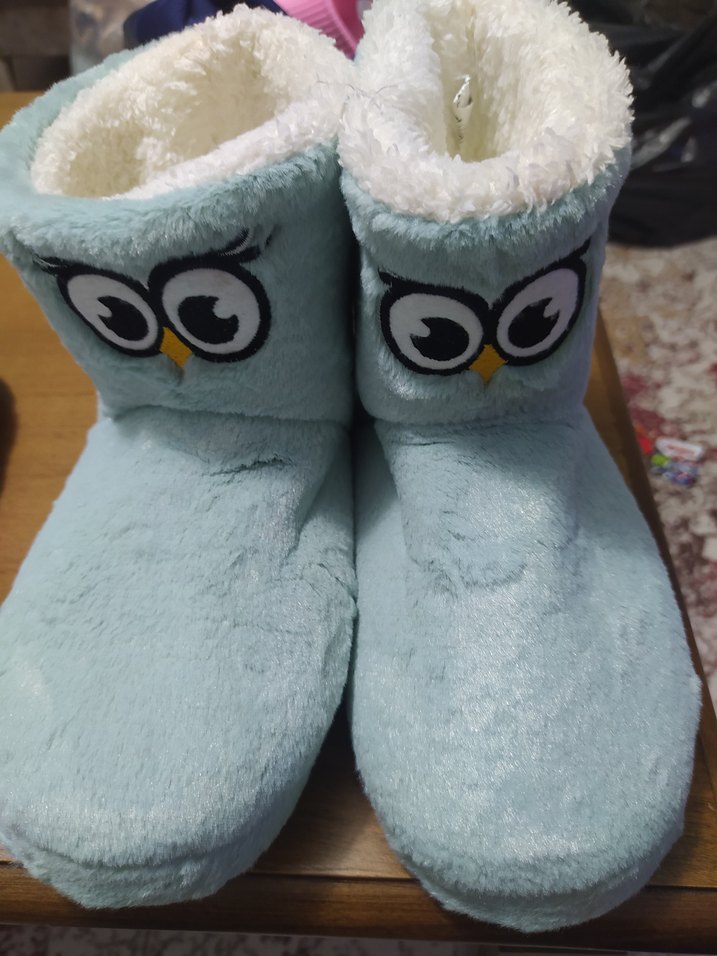 Pastel mavi renkli, içi kürklü kız çocuk ev terliği. Nakışlı baykuş detayları ve yumuşak dokusuyla rahat ve gündelik tarz sunar.