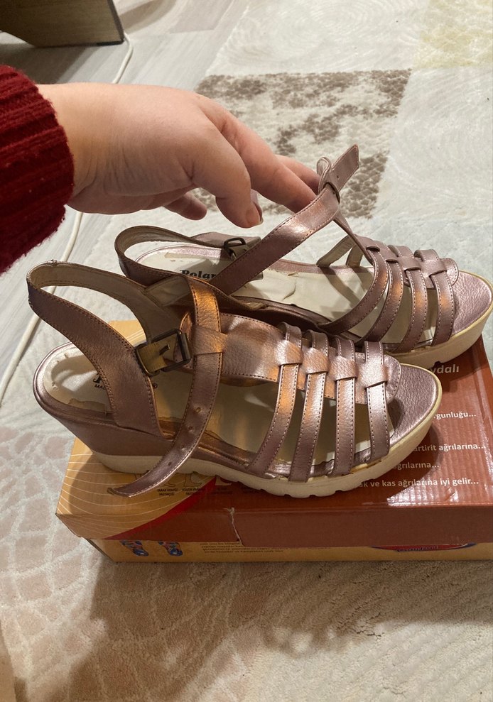 Polaris/Pudra Deri Tokalı Dolgu Topuklu Kadın Sandalet/39 numara/iç kısmında görseldeki gibi soyulma var onun dışında hiç bir kusuru yok. 2 yada 3 kez giyildi