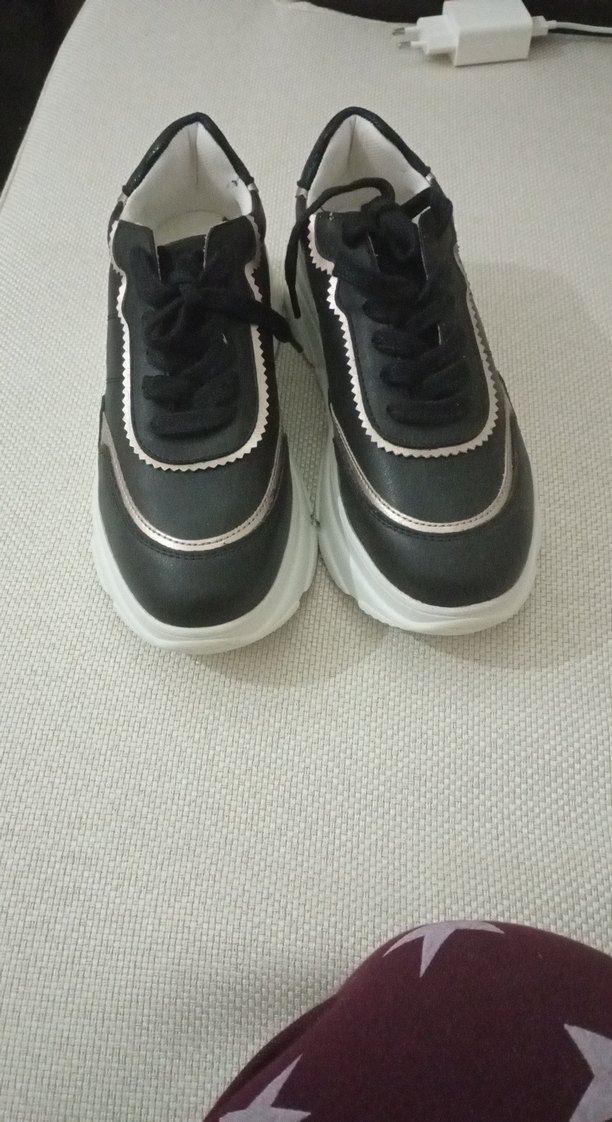 Siyah ve gri renklerde, bağcıklı tasarıma sahip kadın spor ayakkabısı. İnce topuklu ve kauçuk tabanlıdır, spor ve günlük kullanım için uygundur.