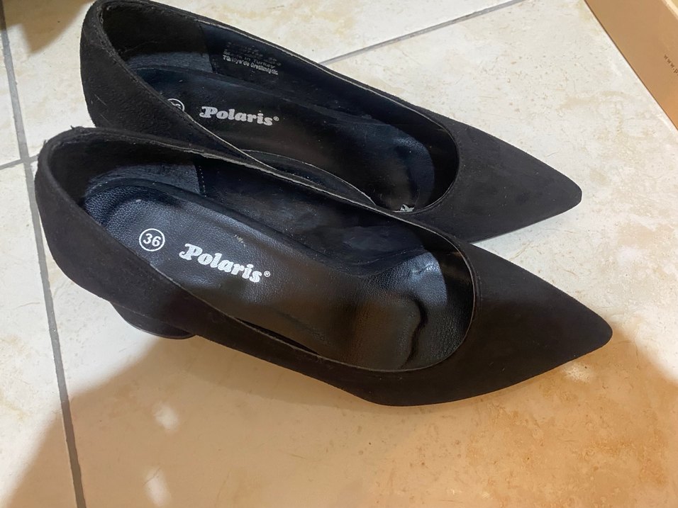 Polaris markalı, siyah renk, tokalı ve blok topuklu kadın stilettoları. Kauçuk malzemeden üretilmiş, ofis kullanımı için uygun sade tasarım.