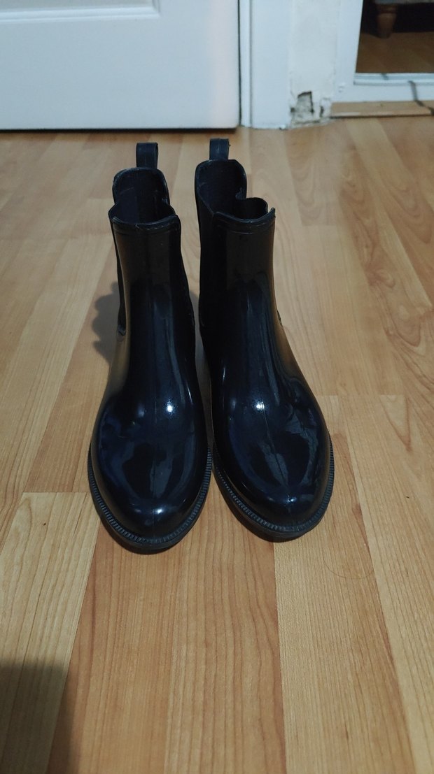 Parlak siyah lastik malzemeden yapılmış, blok topuklu, minimalist goth tarzında kadın botları. Günlük kullanıma uygun, desensiz şık tasarım.
