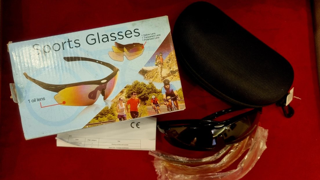Sarı, şeffaf ve polarize lensli spor güneş gözlüğü seti. Koruyucu kutu ve aksesuarlar dahildir. Açık hava aktiviteleri için uygundur ♂️.