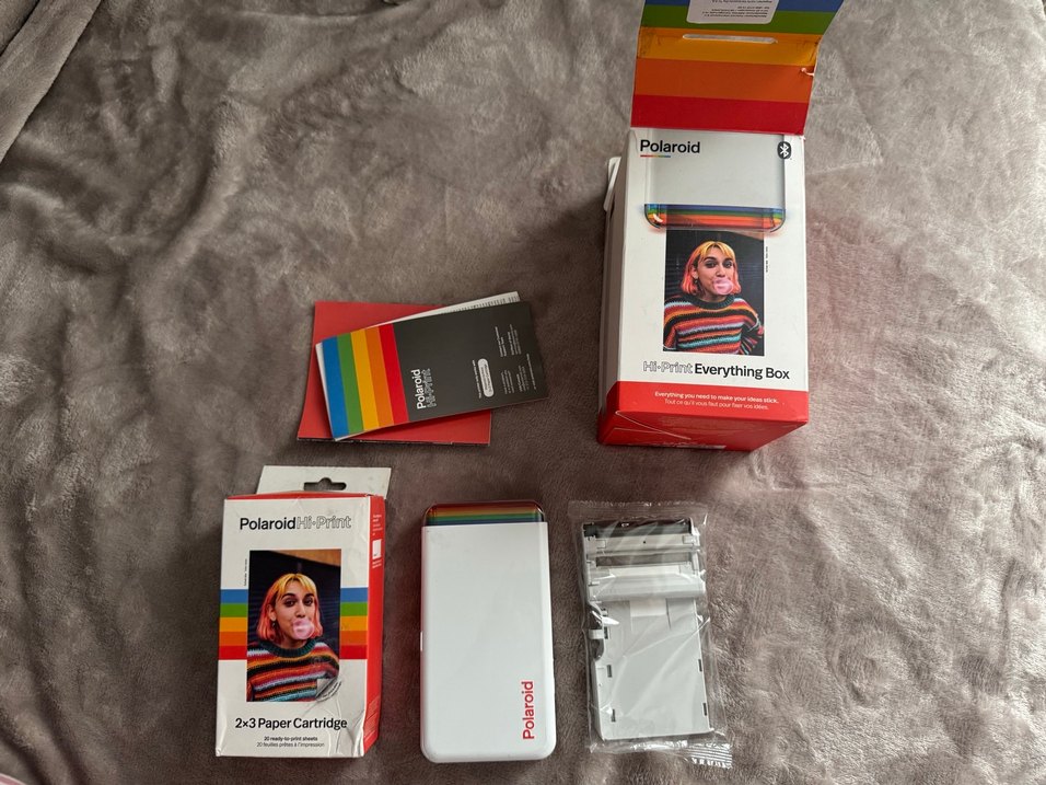 Polaroid Hi-Print Everything Box, küçük ve çok renkli yazıcı ile üç kağıt kartuşu içerir. Anında fotoğraf baskısı için optik karakter tanıma özelliğine sahiptir.