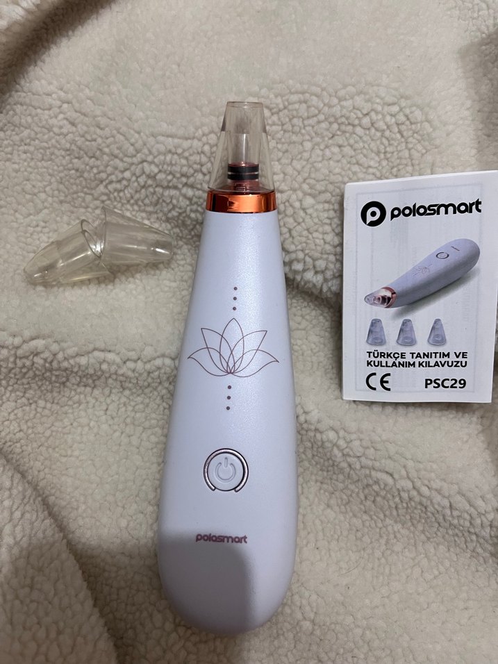 Polasmart PSC29 beyaz yüz temizleme cihazı, güç düğmeli şık tasarıma sahip. Koruyucu kapak ve Türkçe kullanım kılavuzu içerir. CE sertifikalı.