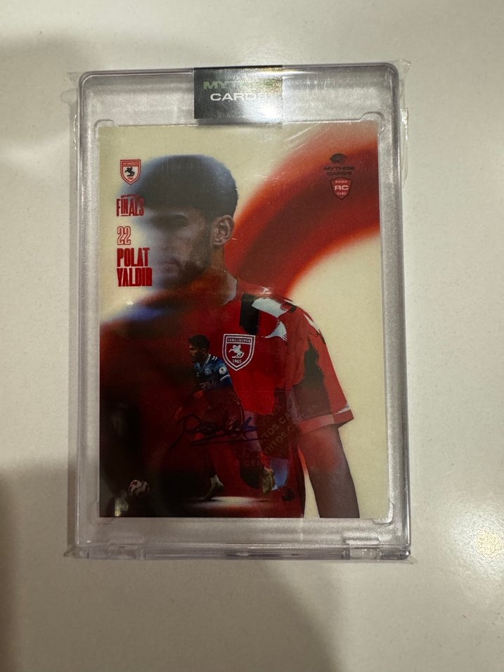 Koyu kırmızı renkte Polat Yalın futbol kartı, takım formasında, parlak kaplamalı ve koruyucu plastik kutuda yer alıyor. ⚽