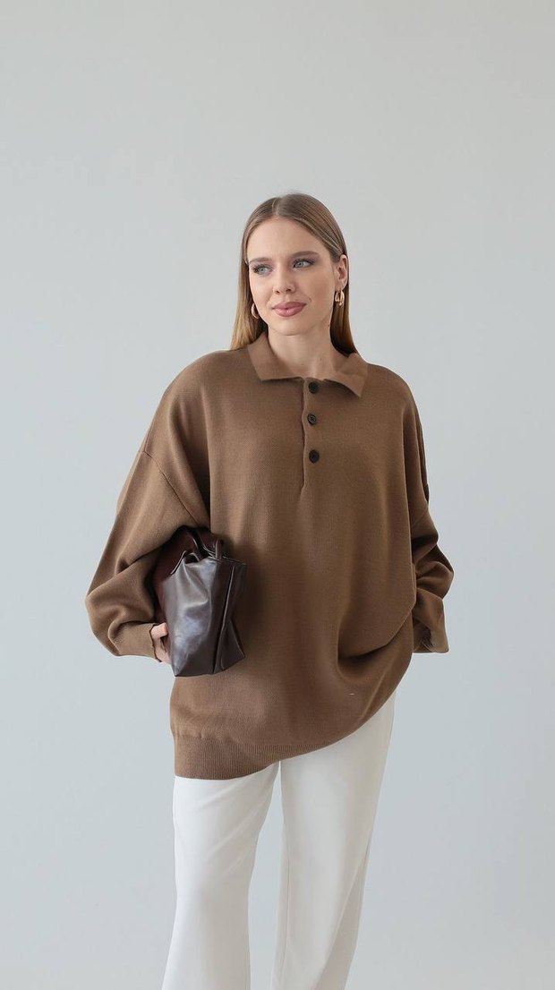 Kahverengi yün kumaştan, bol kesim, uzun kollu ve bisiklet yaka kazak, günlük kullanıma uygun rahat ve şık bir seçenek sunar.