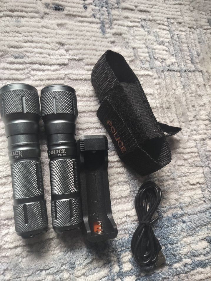 İki adet dokulu tutuşlu siyah el feneri, şarj cihazı, USB kablosu ve 'POLICE' yazılı siyah tutucu kayış içerir. 2 adet. fotodakiler.. normal fiyatı nette 1200tl. 2 adet 1000tl ye veriyorum.