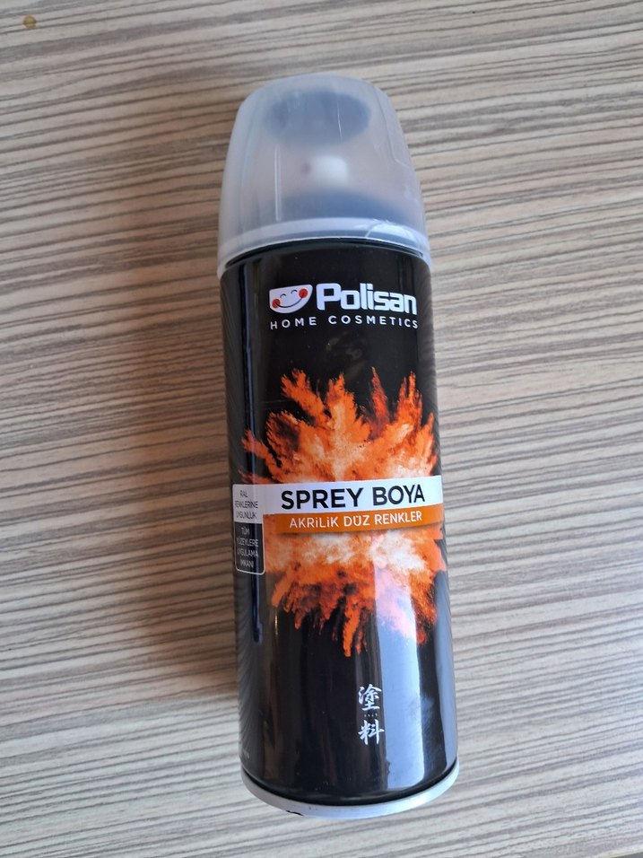 Polisan akrilik sprey boya, siyah kutuda turuncu desenli. Yüzeylerde düzgün ve eşit kaplama sağlar.