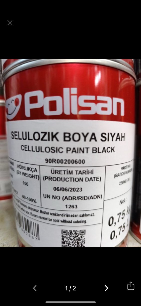 Polisan markasına ait 0,75 kg ağırlığında siyah selülozik boya, 06/06/2023 üretim tarihli. Renklendirme için uygundur.